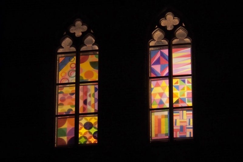 So wollten die 8sw- und 9sw-Kurse das gesamte Fenster mit einem Motiv ausfüllen. Dabei fiel die Wahl auf Kerzen, Tannenbäume und Engel, genau das, was man mit der dunklen Winter- bzw. Vorweihnachtszeit gerne verbindet. Der 8mk Kursgruppe mit Schwerpunkt Kunst beschäftigte sich mit der modernen Glasmalerei aus dem Rheinland. Jede/r Schüler*in fertigte eine freie Komposition als Fenstertransparent an. Vorher wurden Entwürfe gemalt und in der Gruppe ein Gesamtfarbkonzept für die beiden Fenster einer Turmseite festgelegt. Fächerübergreifend zur Mathematik fertigte der 8if –Kurs Transparente mit Dreiecken und Vierecke an.  Dazu passend wurde ein weiteres Fenster vom 10bi- Kurs mit Kreisen gestaltet.