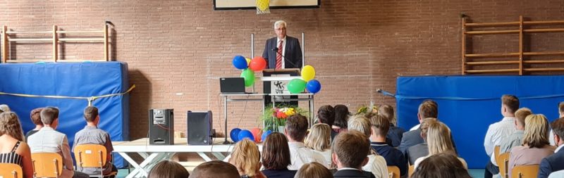 „Vom einem Schulleiter wird erwartet, dass er auf einer Abschlussveranstaltung den Schülerinnen und Schülern noch eine Lebensweisheit mitgibt. Ich habe mich für diese entschieden.“ So beginnt Schulleiter Küpper seine Rede auf der diesjährigen Abschlussfeier der Johannes-Kepler-Schule (JKS) und fügt hinzu: „Wir alle haben in den vergangenen Monaten viel lernen müssen.“ Man blickt in zustimmende Gesichter, denn jeder spürt, dass dies keine normale Abschlussfeier ist. Aber immerhin war es nach einem Jahr Pause überhaupt wieder möglich, unter Einhaltung eines strengen Hygienekonzeptes (welches u.a. eine Trennung in zwei Teil-Feierlichkeiten vorsah) eine Abschlussfeier durchzuführen.