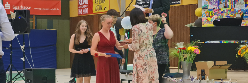 Um 19 Uhr begann dann der offizielle Teil der Abschlussveranstaltung, durch den die Zehntklässler Jessica und Mick als Moderatorenteam ausgesprochen souverän führten. In seiner Abschlussrede hob Schulleiter Thomas Küpper die Entwicklung hervor, die die Absolventen in den letzten sechs Jahren durchliefen: beschäftigte sechs Jahre zuvor noch die Frage „Komme ich mit meiner besten Grundschulfreundin / meinem besten Grundschulfreund in eine Klasse?“ die Gemüter der Kinder, ist es nun die Frage nach dem weiteren Lebensweg, die die Jugendlichen und jungen Erwachsenen umtriebe. Er betonte, dass man zurecht stolz auf die erbrachten Leistungen sein könne. Den Glückwünschen schloss sich der ebenfalls anwesende Christian Canzler, 1. Beigeordneter der Stadt Viersen, an: egal ob in einer bevorstehenden Ausbildung oder auf dem weiteren schulischen Werdegang – er wünsche den Absolventinnen und Absolventen viel Erfolg.